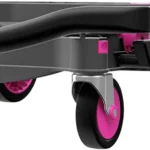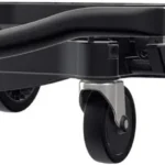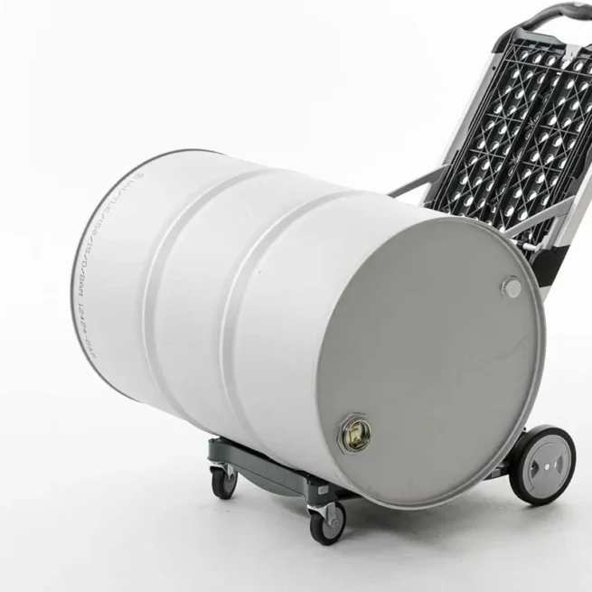 Securing straps are attached to secure the collapsible box. Accidental rolling away is prevented by activating the parking brake. Transport via stairs is made possible by its freestanding wheels. The wheels can be removed with a few easy steps, and stored in the base platform to save space.